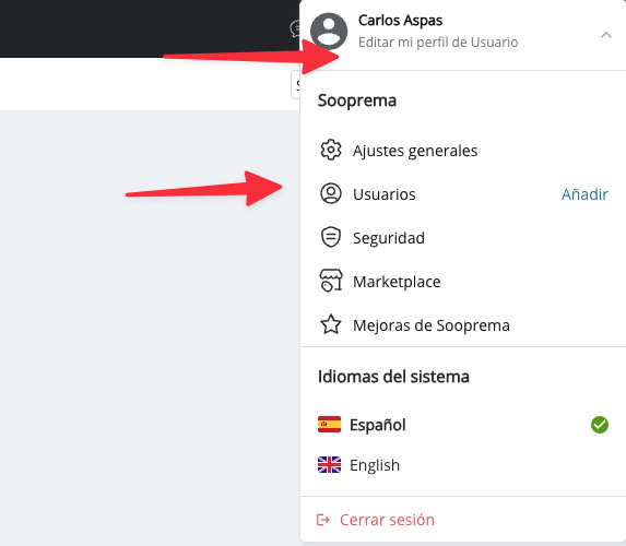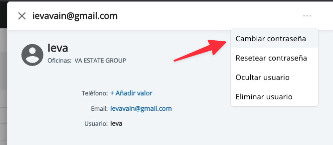 Para cambiar la contraseña de un usuario en el CRM, accede al menú superior derecho (debajo de tu nombre) y selecciona Usuarios.