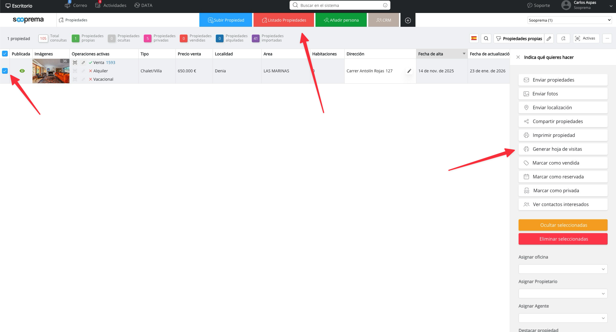Para imprimir una ficha desde el CRM tienes que ir al listado de propiedades, seleccionar la propiedad que quieres imprimir y pulsar en el botón indicado en los menus que aparecen en la ventana lateral derecha.